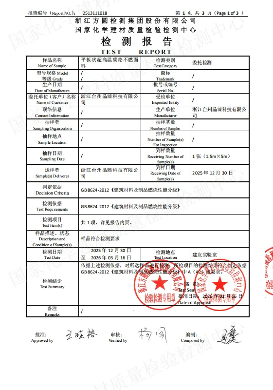 近期,晶臻科技自主研发的Black Fire碳纶超高温不燃面料,成功通过国家化学建材质量检验检测中心——GB 8624-2012《建筑材料及制品燃烧性能分级》进行的A(A2)级检测。