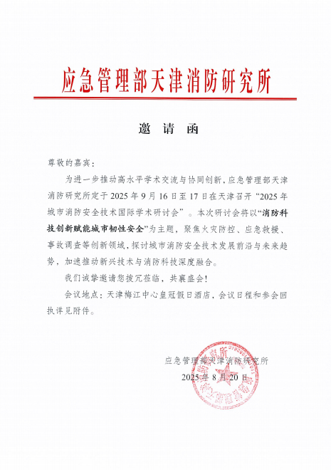 近日,浙江台州晶臻科技有限公司(以下简称“晶臻科技”)荣幸宣布,公司已正式受邀参与由应急管理部天津消防研究所主办的2025城市消防安全技术国际学术研讨会。此次盛会旨在汇聚世界消防安全领域的企业,共同探讨城市消防安全技术的研究成果与发展趋势。
